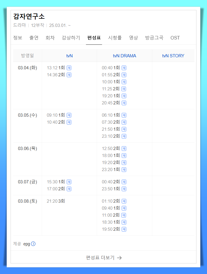 기타 편성 정보는 tv 편성표에서 확인하고 재방송으로 시청할 수 있습니다.