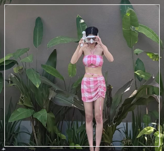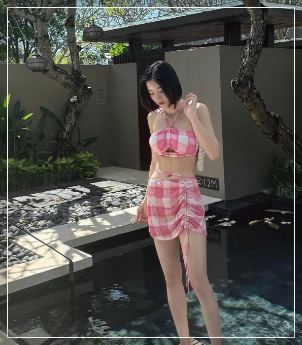 1. 권은비 비키니 체크무늬 핑크 스윔웨어 – 키치+체형 커버까지!