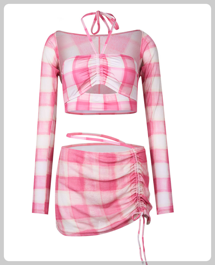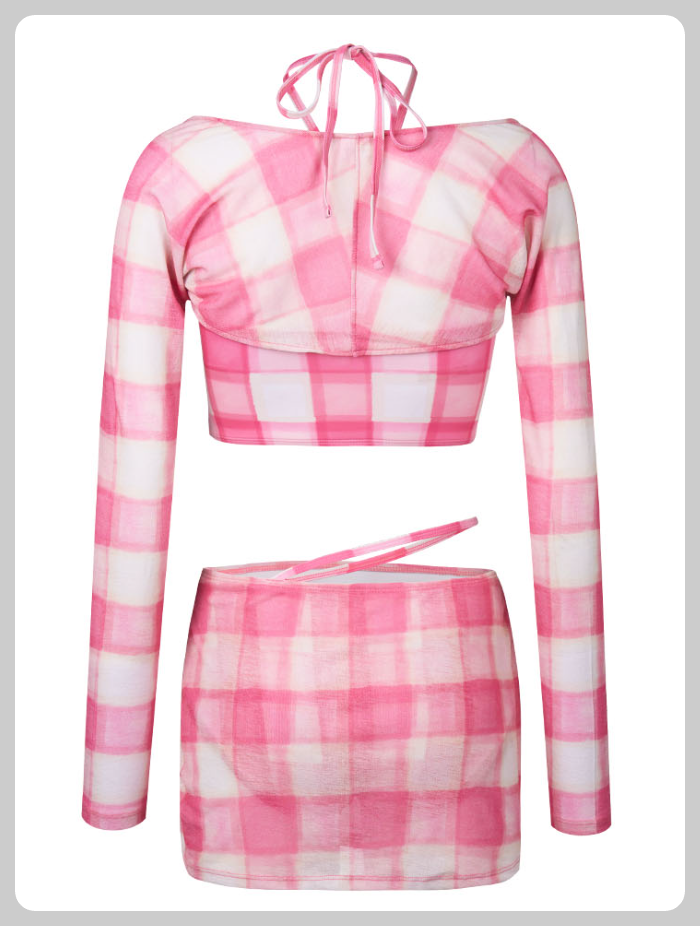 핑크 체크 패턴에 볼레로 포함 3피스 세트 구성이라