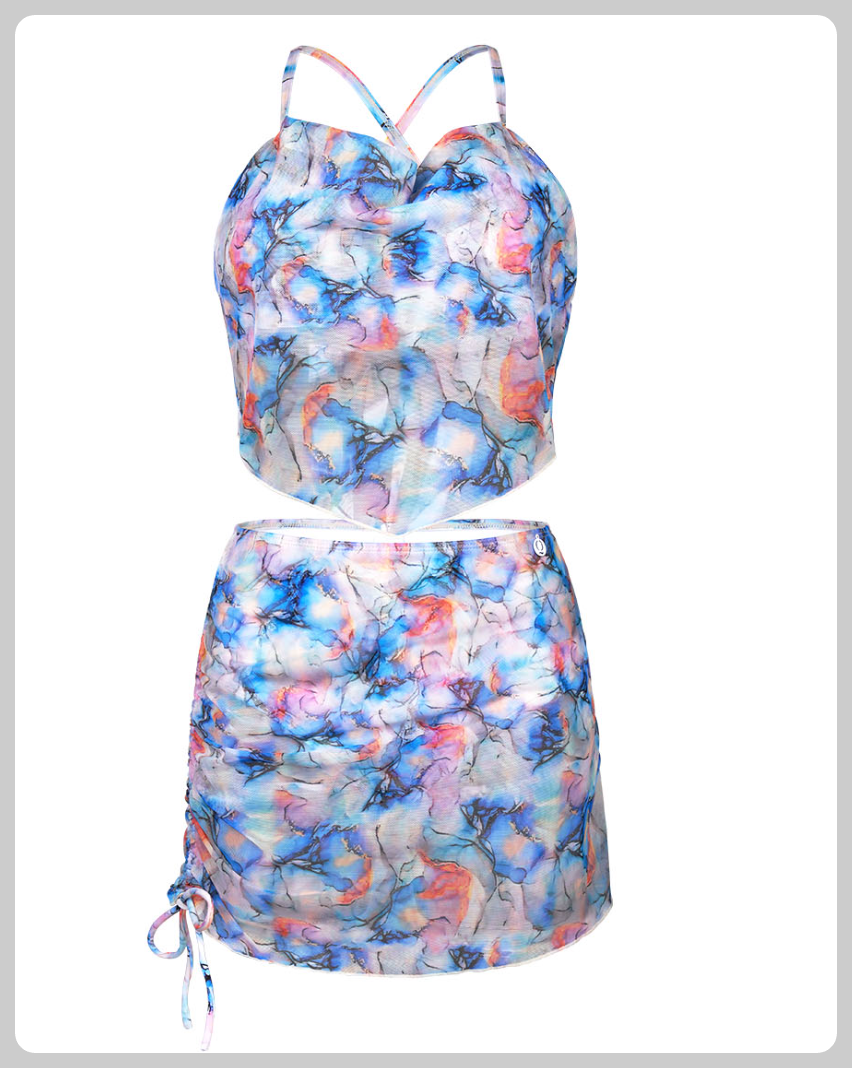 물결이 흐르는 듯한 프린트에 X자 스트랩 뒷태까지 완벽한 조합.
