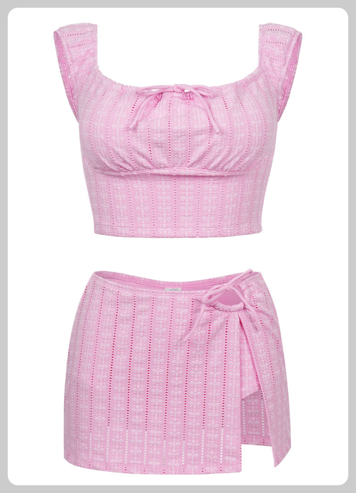 핑크 데이지 패턴과 오프숄더 디자인, 복부 커버 스커트까지 완벽해요.