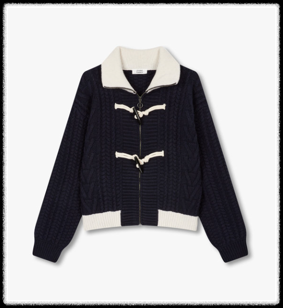 배색 카라와 토글 디테일이 들어간 슬림핏 니트 가디건으로,
