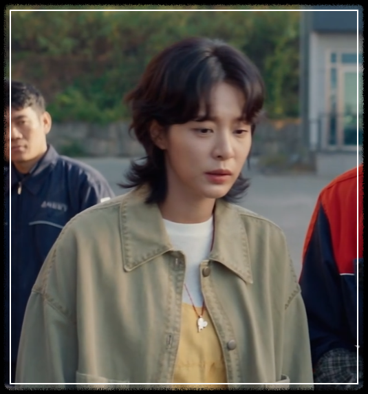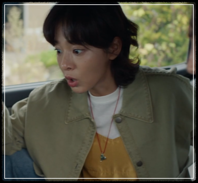 카키 컬러의 아우터에 레드 스트링 목걸이로 상큼한 포인트를 더해준 장면, 기억하시나요?