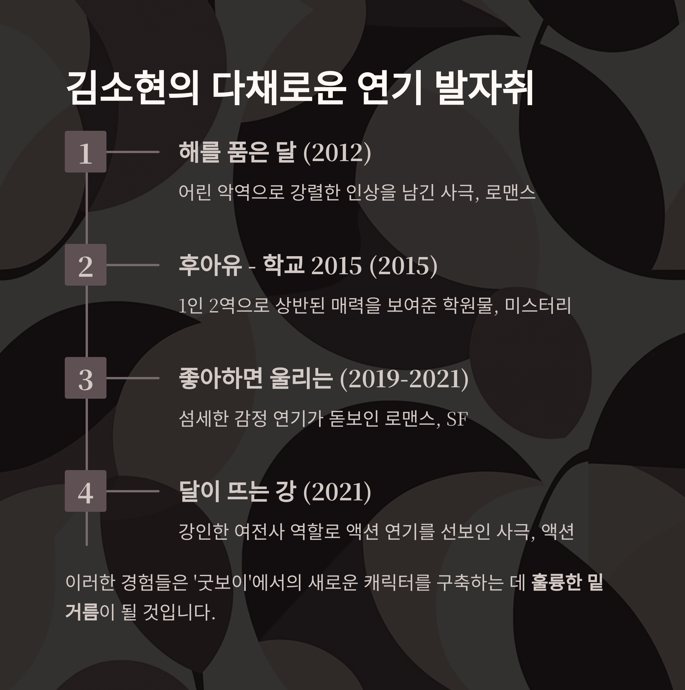 김소현은 이미 다수의 작품을 통해 연기력을 인정받았지만, 굿보이는 그녀의 필모그래피에 또 하나의 강렬한 인상을 남길 작품이 될 잠재력을 가지고 있습니다.