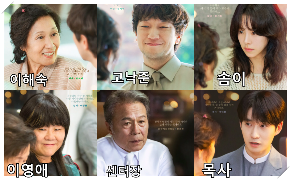 - 이해숙 (김혜자): 억척스럽게 살아온 80세 할머니, 천국에서의 재회를 통해 삶과 사랑을 재발견하는 인물.