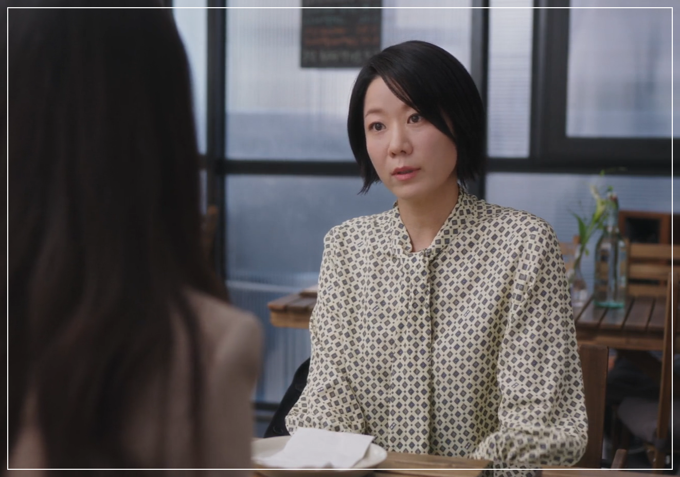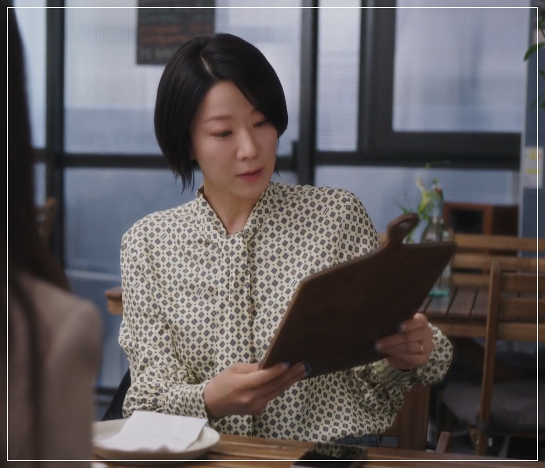 ✔ 직장 동료 ‘한대리’가 점심을 함께 먹자고 제안할 때 입었던 블라우스! ✔ 부드러운 실루엣과 패턴이 우아한 분위기를 더해줌✨