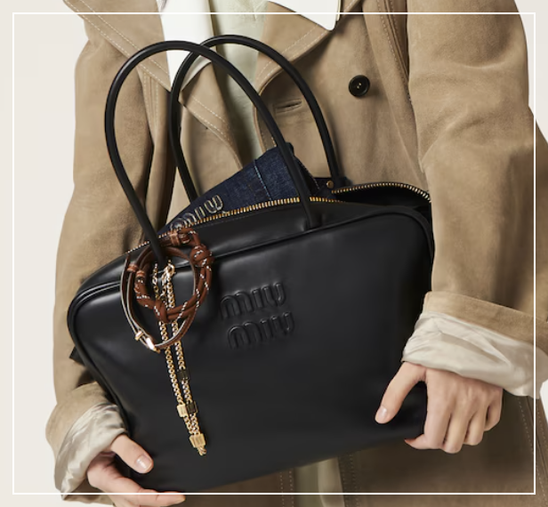 부드럽고 매끈한 소가죽 소재, 여기에 골드 하드웨어와 미우미우 엠보싱 로고가 빛나던 바로 그 가방!