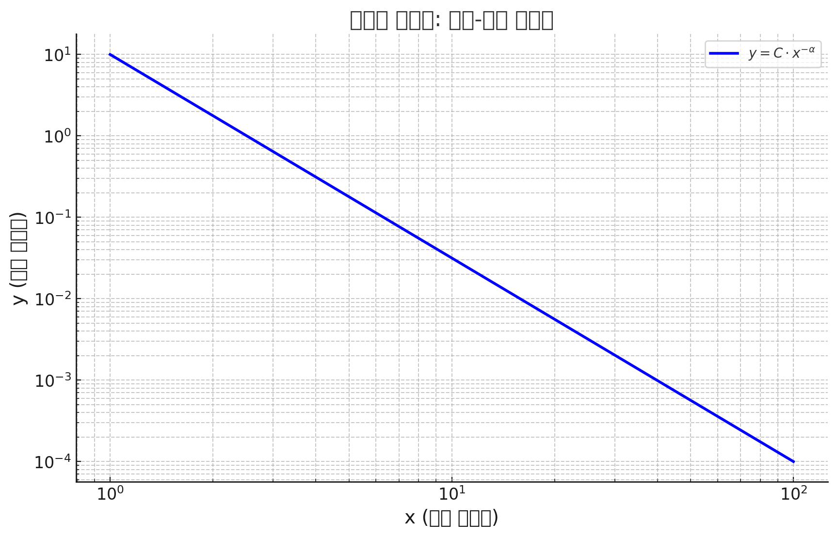 여기서 y는 빈도나 크기를 나타내고, x는 대상이 되는 변수입니다. C는 비례 상수, α는 멱지수로 불리는 지수입니다. 이 관계의 특징은 일부 큰 값이 매우 큰 영향을 미치는 반면, 작은 값들이 훨씬 더 많이 존재하는 것입니다. 예를 들어, 몇몇 부유한 사람들이 전체 부의 상당 부분을 소유하고 있는 현상이나, 소수의 사이트가 인터넷에서 많은 링크를 받고 있는 현상 등이 여기에 해당합니다.