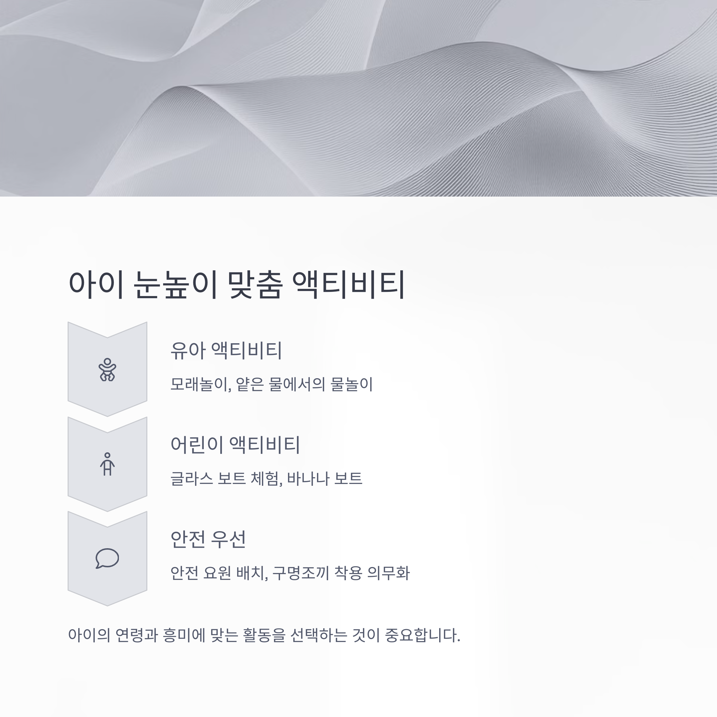 | 의류 | 수영복, 래시가드, 아쿠아슈즈, 여벌옷, 가벼운 겉옷 | 햇볕 차단을 위한 모자와 선글라스 필수 |
