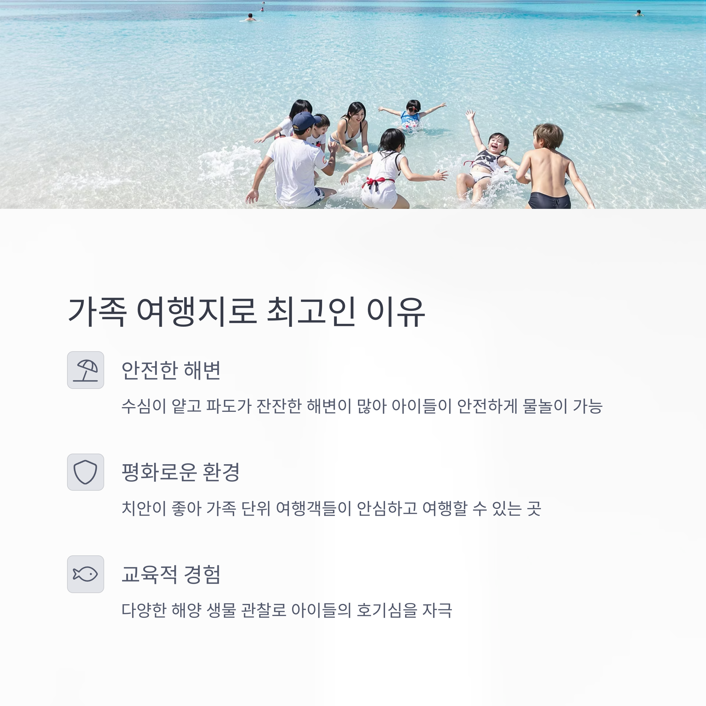 수심이 얕고 파도가 잔잔한 해변이 많아 아이들이 안전하게 물놀이를 즐기기에 이상적입니다.