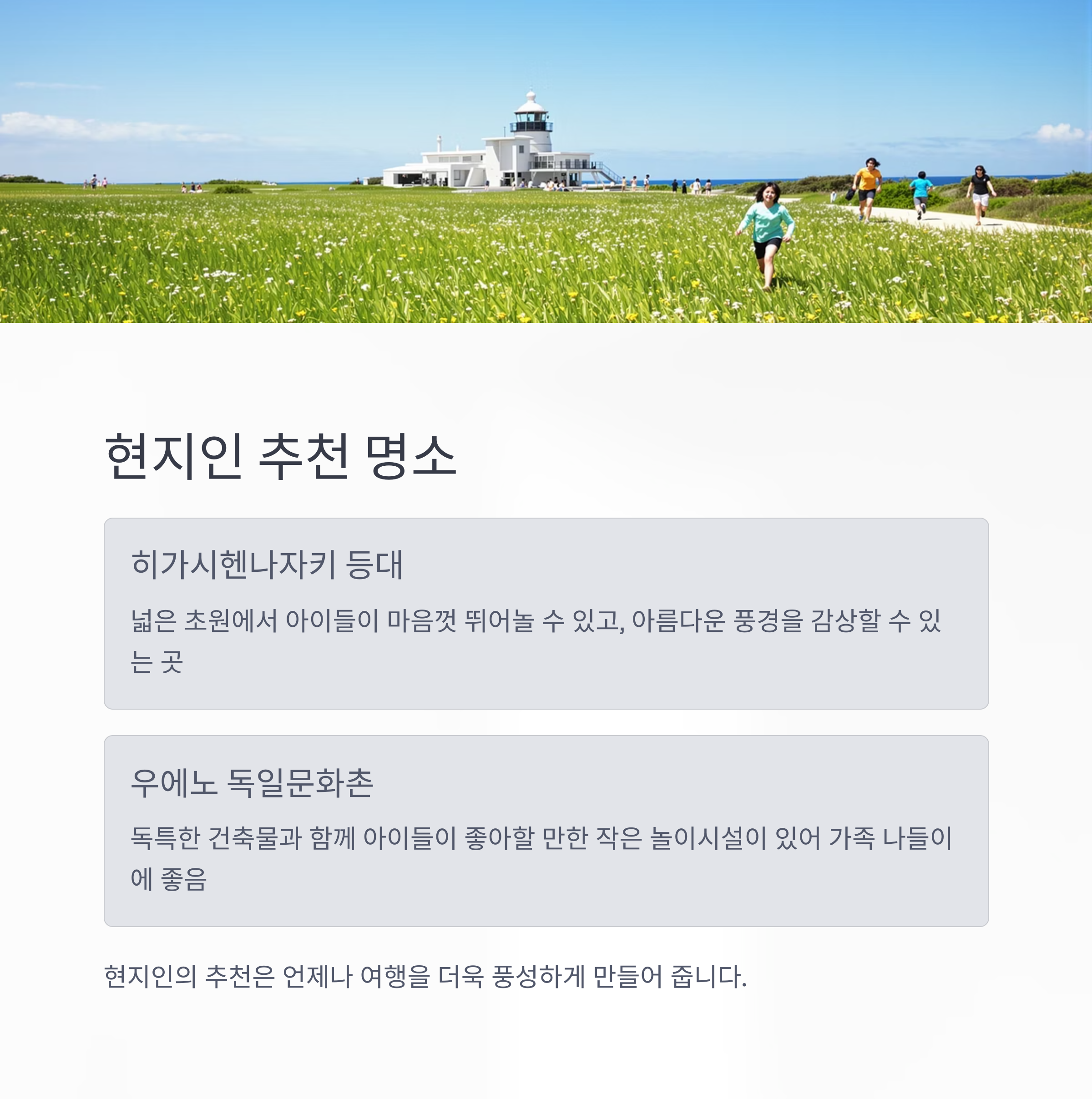 ""아이들과 함께라면 히가시헨나자키 등대 주변의 넓은 초원을 꼭 가보세요.