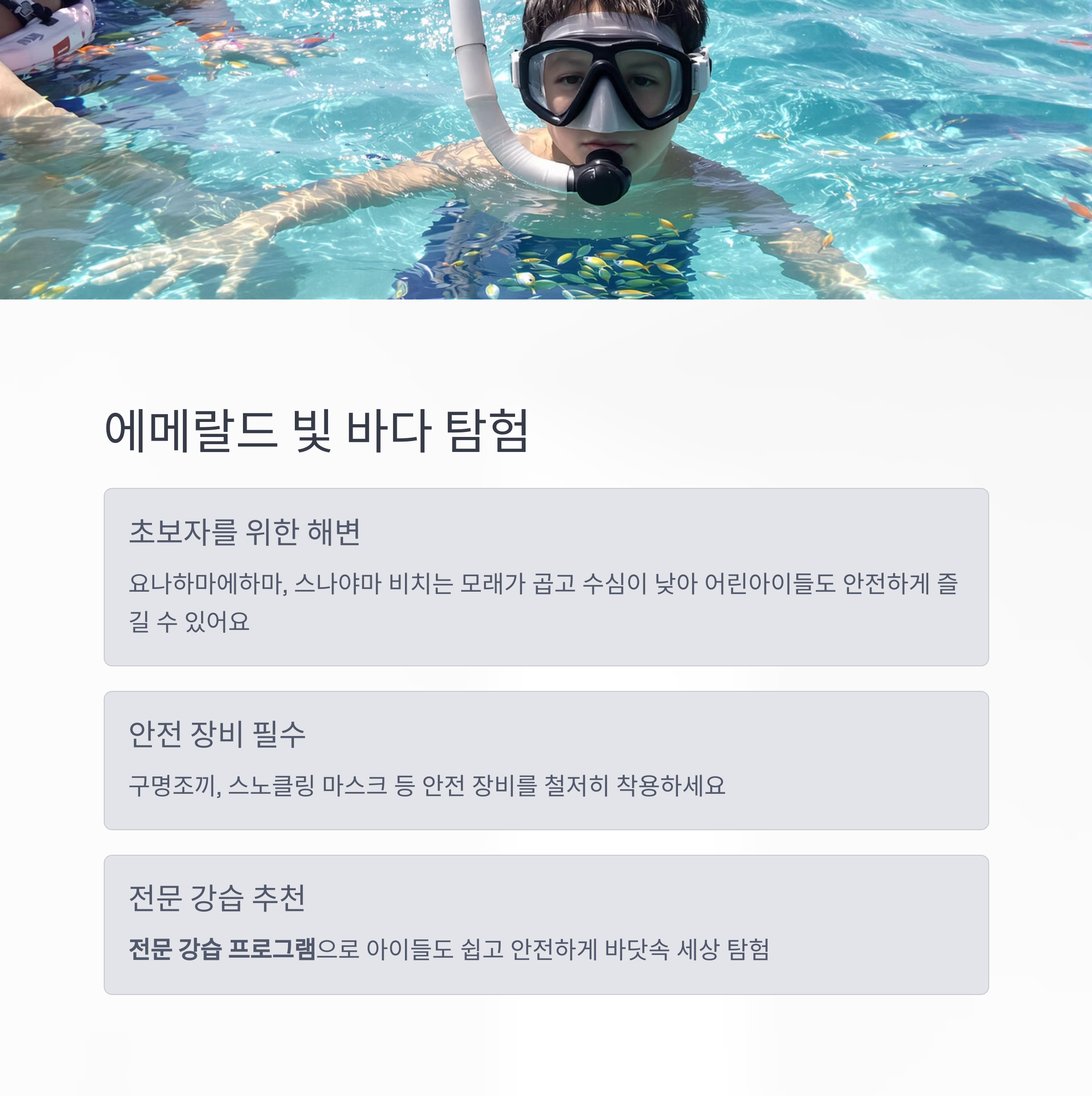 본격적인 스노클링은 아이의 연령과 수영 실력을 고려하여 구명조끼, 스노클링 마스크 등 안전 장비를 철저히 착용한 후 시작하는 것이 중요합니다.