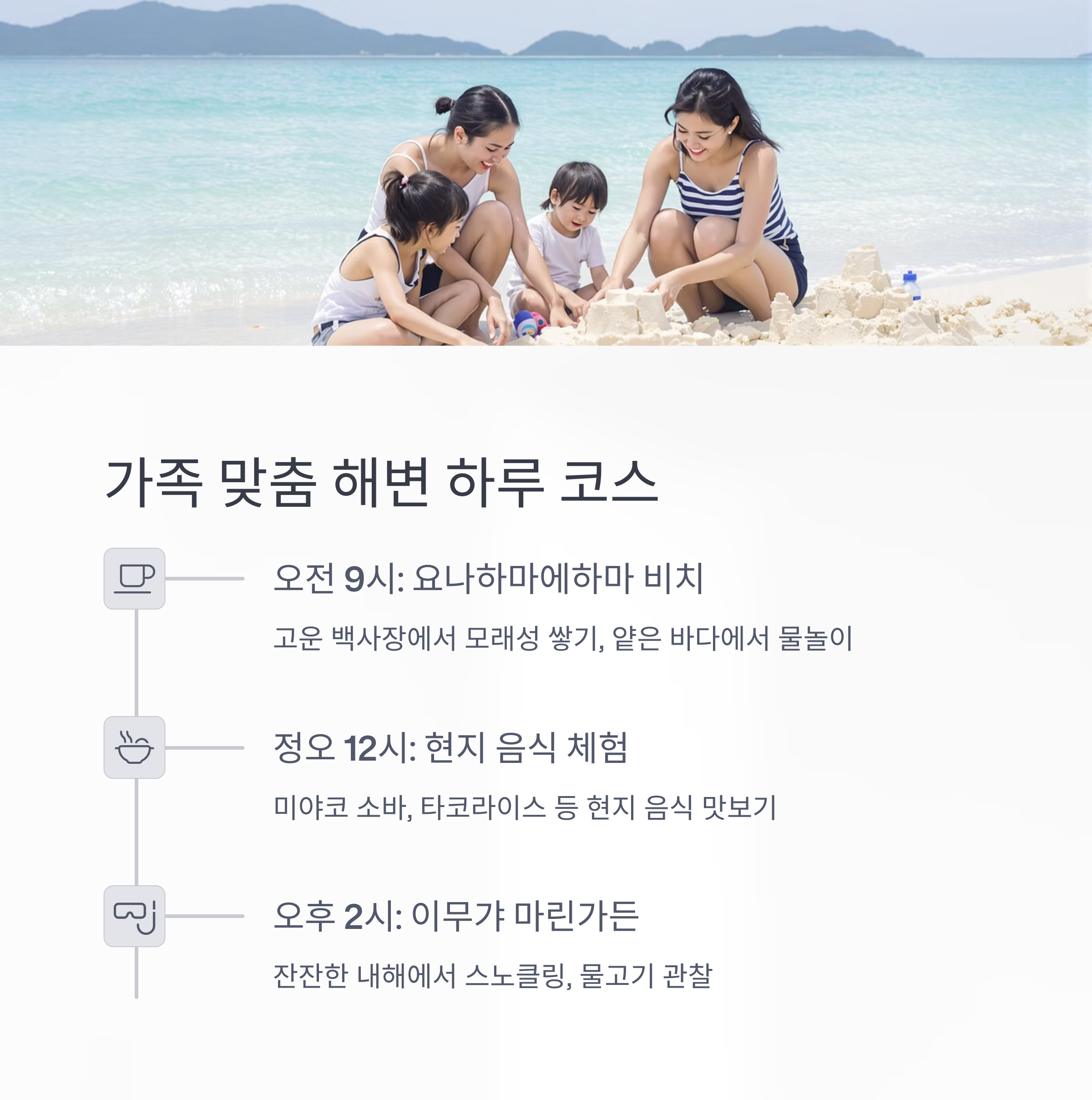 오전 9시: 요나하마에하마 비치 도착. 고운 백사장에서 신나게 모래성을 쌓고, 얕은 바다에서 첨벙첨벙 물놀이를 즐깁니다.