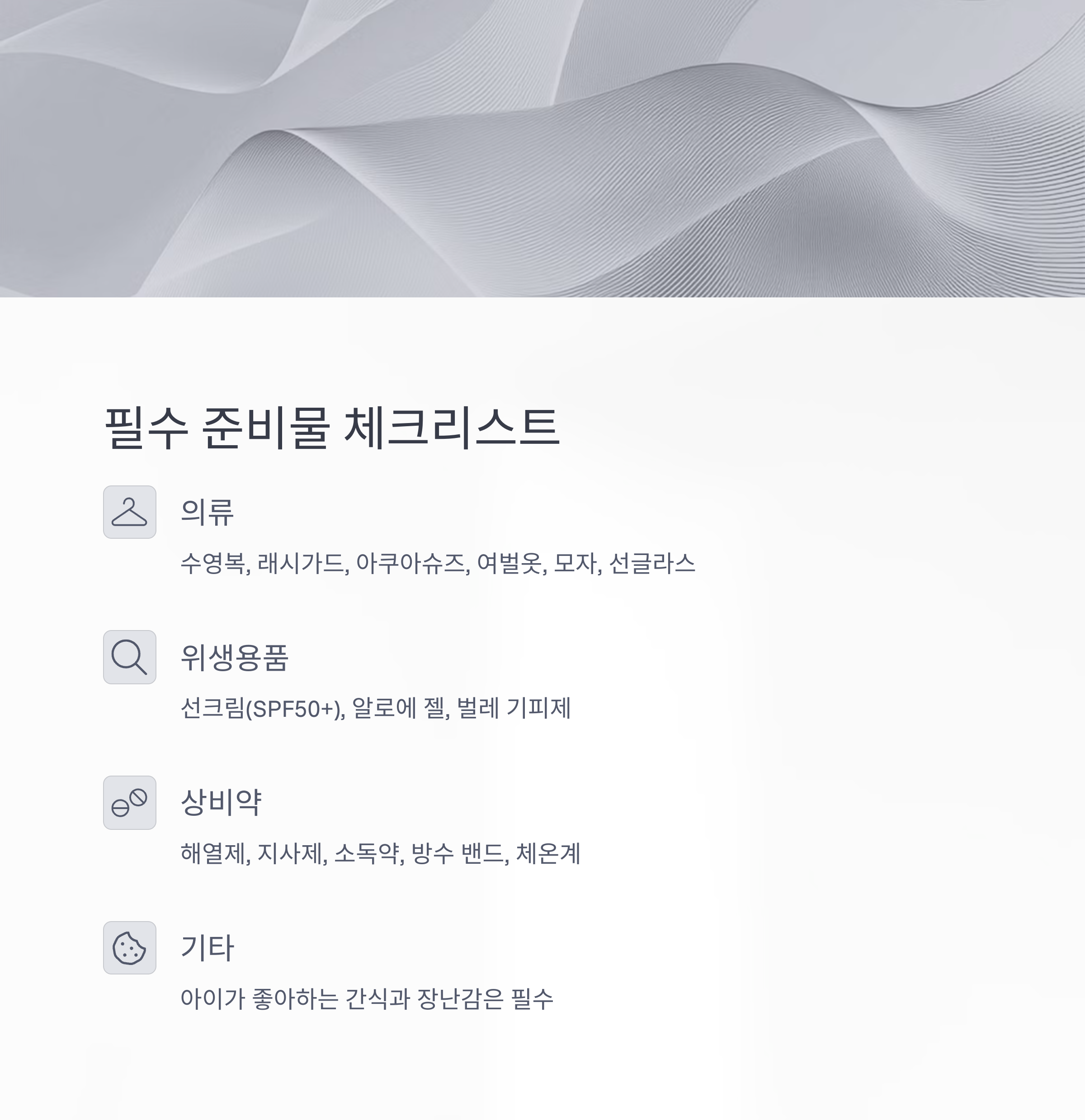 | 위생용품 | 선크림(SPF50+), 알로에 젤, 벌레 기피제, 휴대용 세면도구 | 아이 피부에 맞는 순한 제품 선택 |