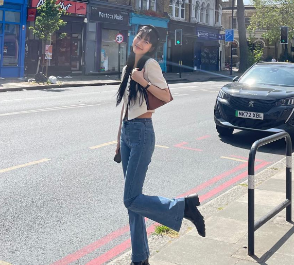 노카라 디자인의 크롭 자켓과 부츠컷 팬츠의 조합이 정말 멋졌어요. 2023년에 찍힌 사진인데도 지금 봐도 전혀 촌스럽지 않은 세련된 스타일이죠.