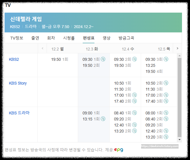 - 방송 시간: 2024년 12월 2일부터 매주 월~금 저녁 7시 50분 (KBS2)