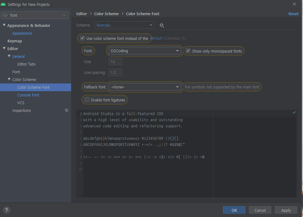 appearance 폰트도 d2coding로 하고 한글은 이게 젤 좋아 보인다
