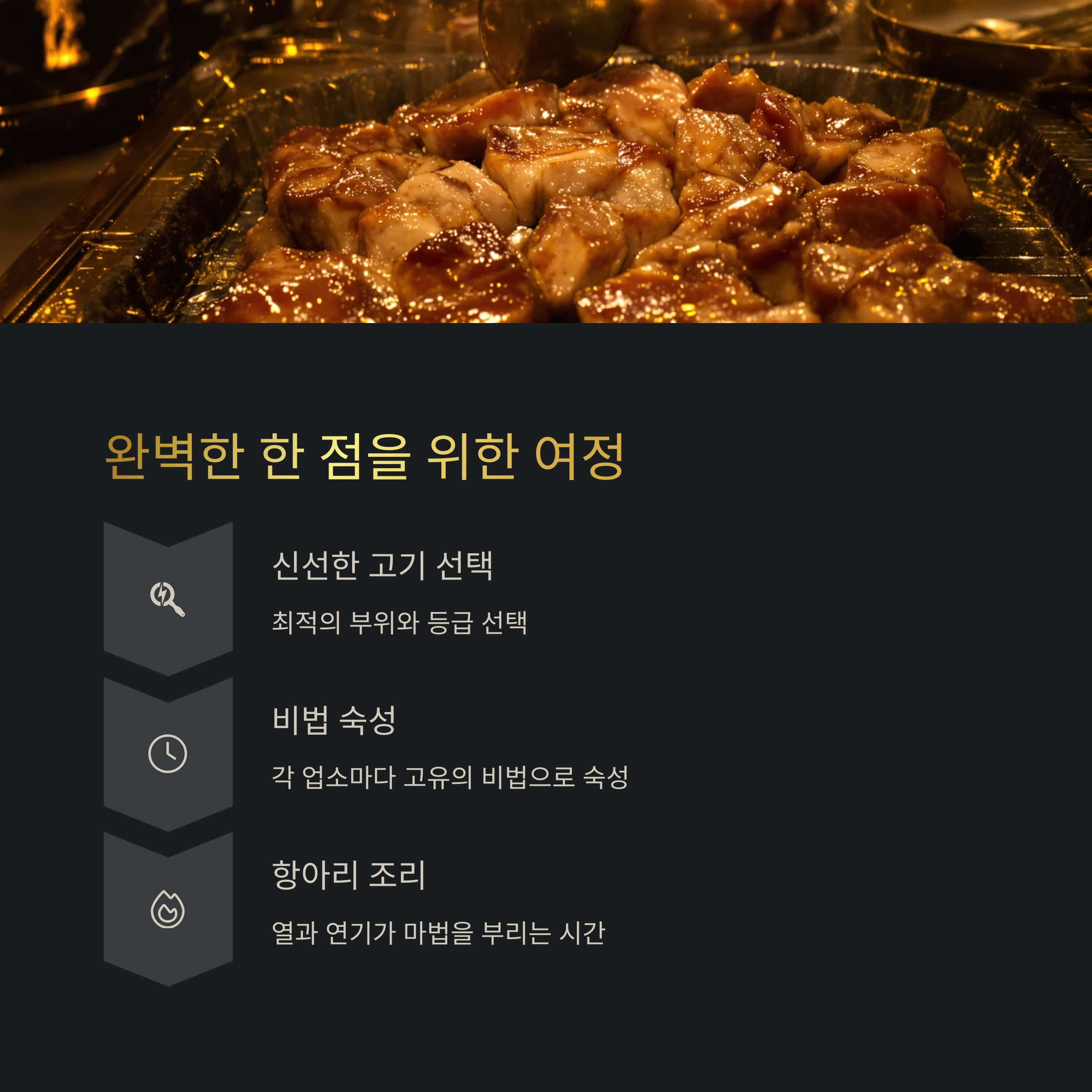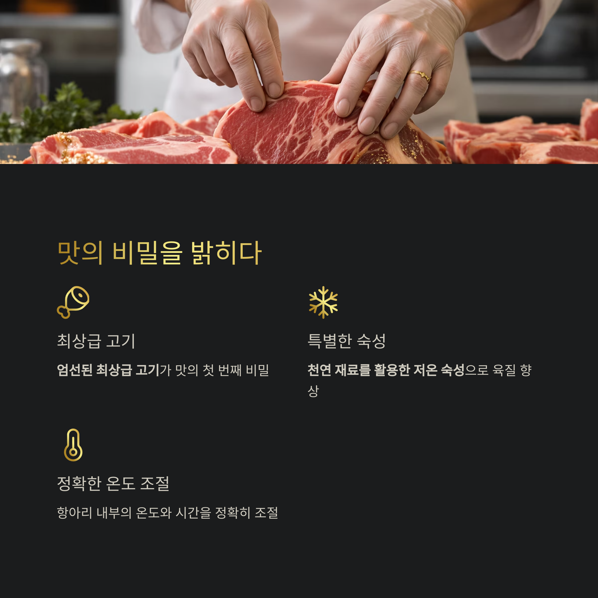 하지만 힌트를 드리자면, 천연 재료를 활용한 저온 숙성을 통해 육질을 최상으로 끌어올립니다.