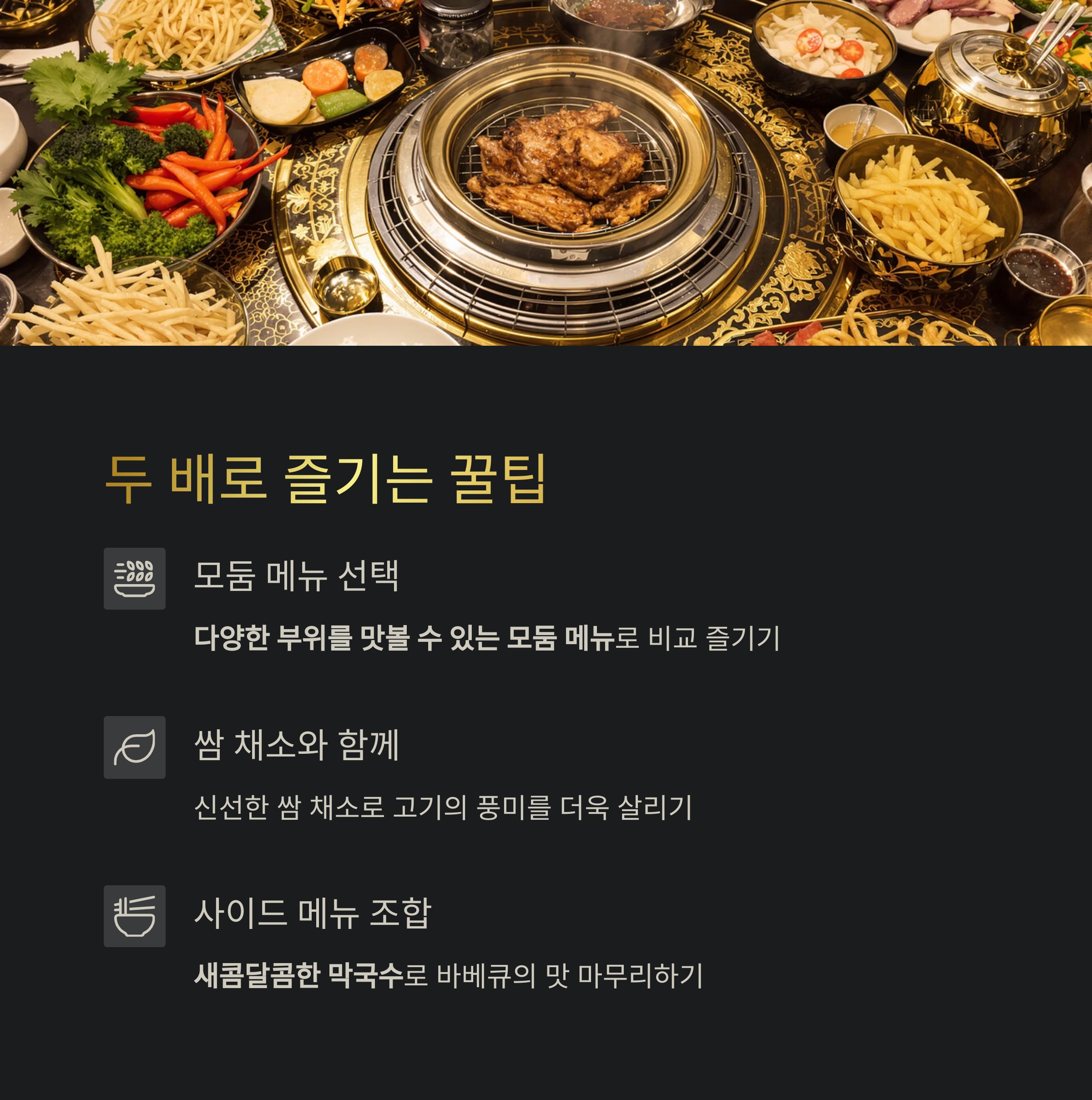 특히 새콤달콤한 막국수는 바베큐의 기름진 맛을 깔끔하게 마무리해 줍니다.