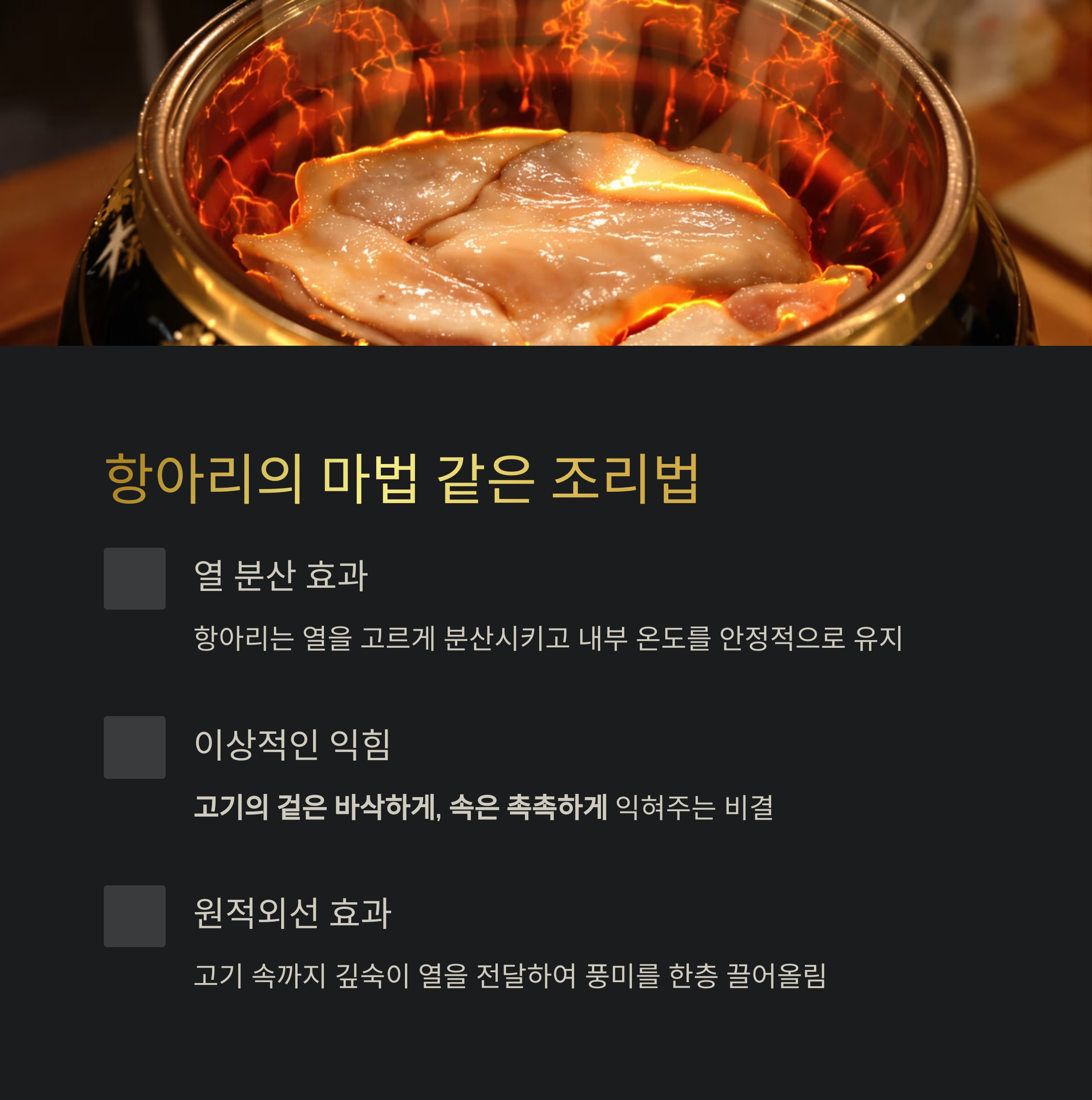 또한, 항아리 특유의 원적외선 방출 효과는 고기의 속까지 깊숙이 열을 전달하여 풍미를 한층 끌어올립니다.