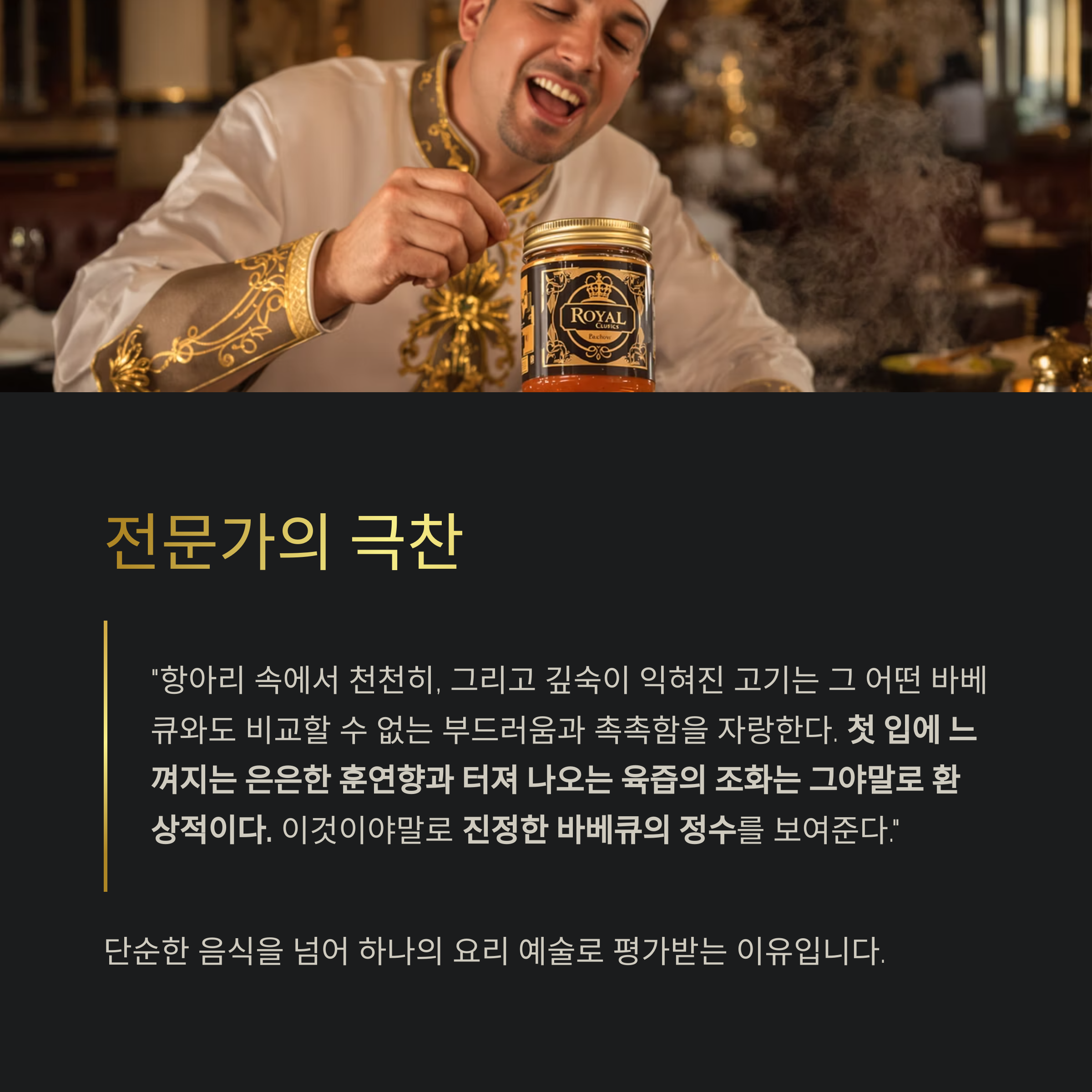 이것이야말로 재료와 조리법의 완벽한 이해가 빚어낸 예술작품이며, 진정한 바베큐의 정수를 보여준다고 할 수 있다.""