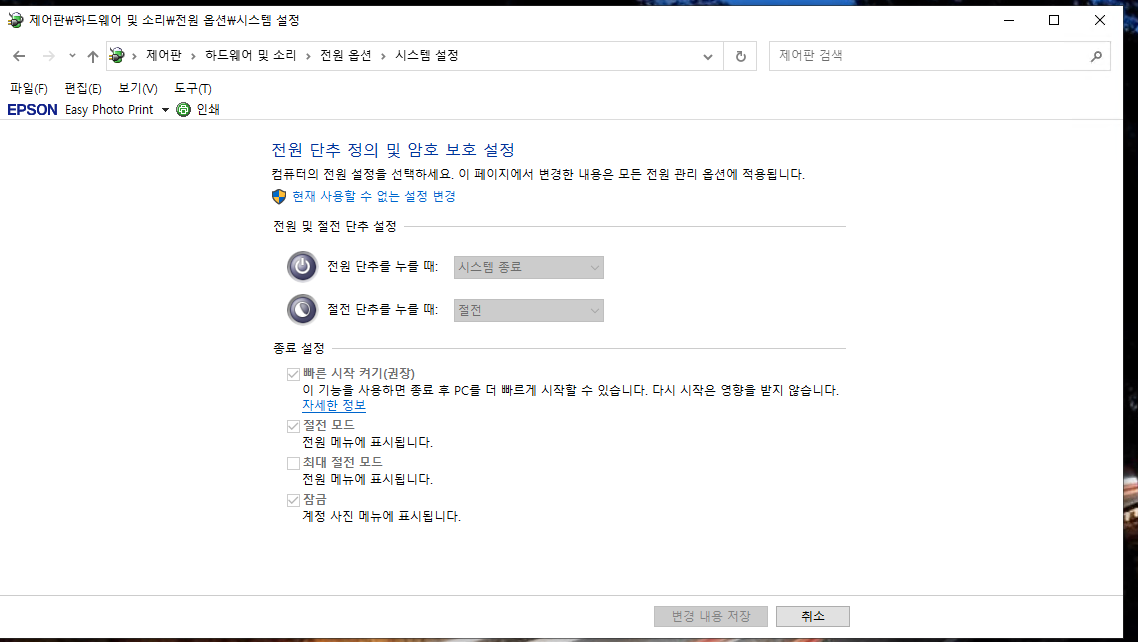 위쪽에 현재 사용할 수 없는 설정 변경을 클릭해 주면 변경이 가능하다