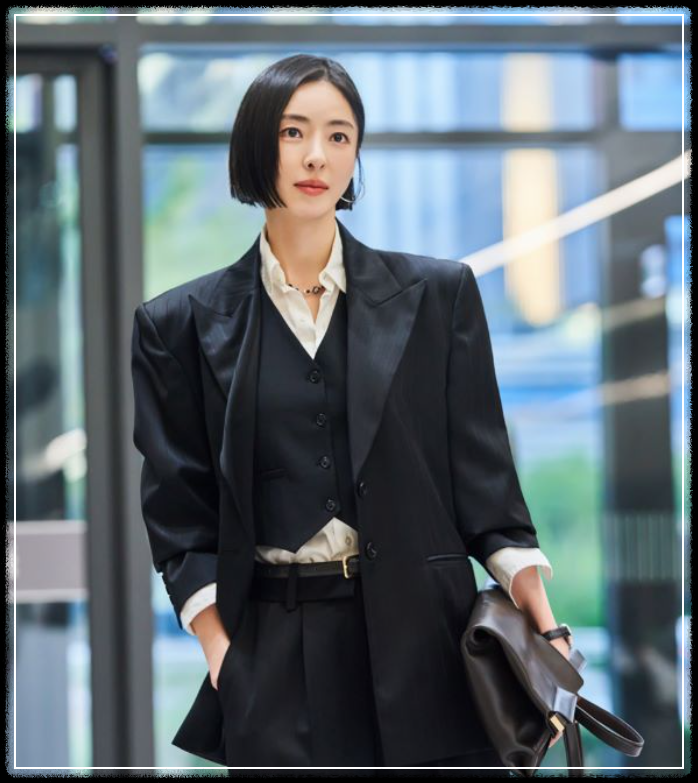 퀀트 전나래 역의 이다희는 블랙 스트라이프 수트 셋업으로 완벽한 포멀룩을 선보였어요.