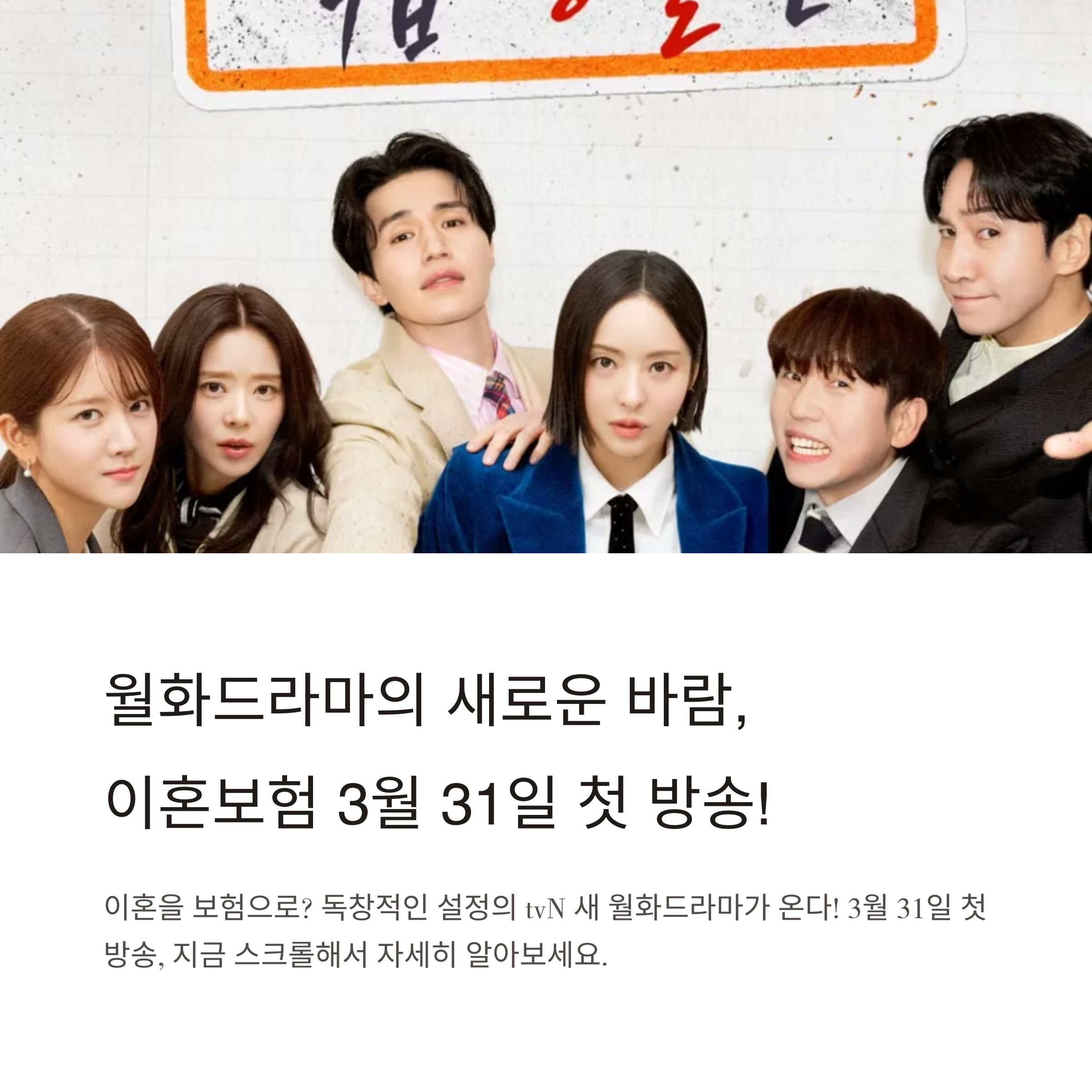 오늘은 많은 사람들의 관심을 받고 있는 새로운 tvN 드라마 이혼보험에 대해 소개드리려 합니다.