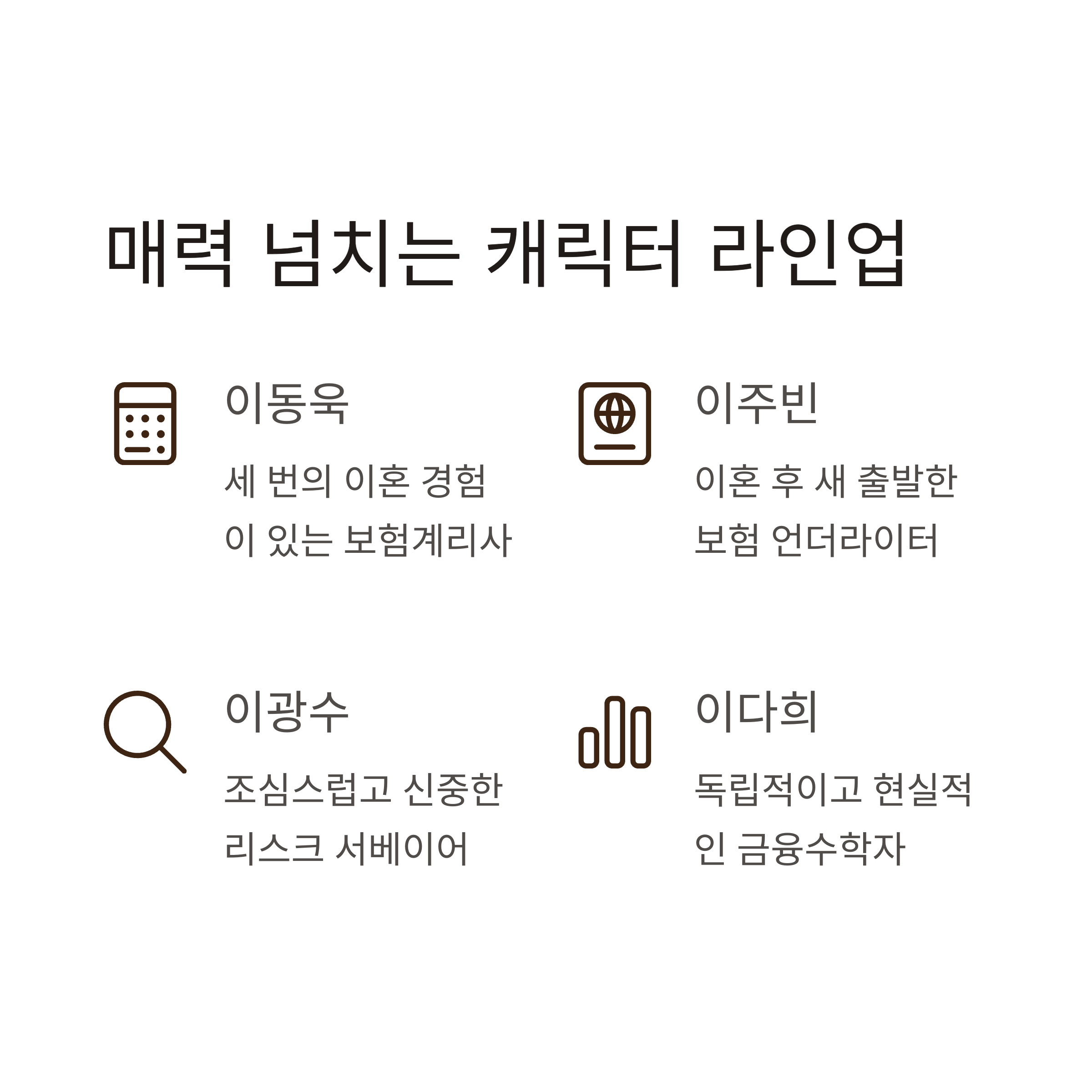 주연 배우들의 라인업 역시 화제를 모으고 있습니다. 이동욱, 이광수, 이다희, 이주빈이라는 화려한 출연진 외에도 연출을 맡은 이원석 감독과 극본을 담당한 이태윤 작가 역시 모두 '이'씨 성을 갖고 있어, 우연치고는 놀라운 구성이라는 반응이 많습니다. 이동욱은 세 번의 이혼을 겪은 보험계리사로, 이광수는 리스크 서베이어 역을 맡아 각자의 매력을 보여줄 예정입니다. 이러한 설정은 단순한 로맨스가 아닌 캐릭터들의 서사와 심리를 깊이 있게 탐구하게 만드는 요소로 작용합니다.