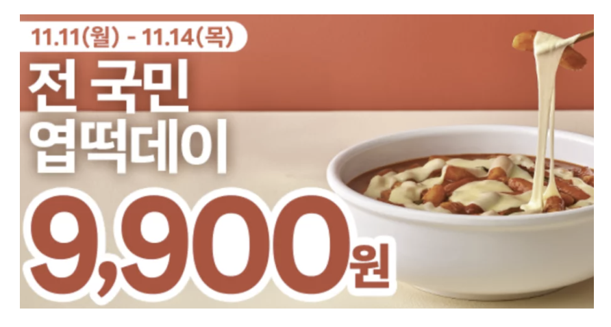 **'전 국민 엽떡데이'**는 2024년 **11월 11일(월)부터 11월 14일(목)**까지 진행되는 특별 할인 행사입니다. 엽떡을 좋아하는 분들은 이 기회를 놓치지 마세요! 이 기간 동안 엽떡 앱으로 주문하면 매운맛 떡볶이를 할인된 가격에 즐길 수 있어요.