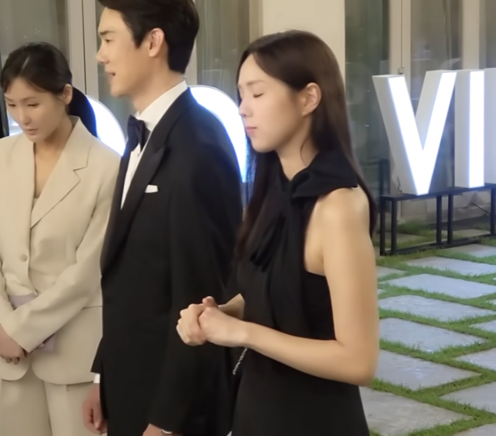 - 또 다른 장면에서는 MELISSA 스퀘어넥 트위드 원피스를 입고 등장했어요. 고급스러운 트위드 소재와 머메이드 라인 디자인이 돋보이며, 스퀘어넥 덕분에 쇄골 라인이 강조되어 여성스러운 매력을 발산했습니다. 가격은 약 40만 원 내외입니다.