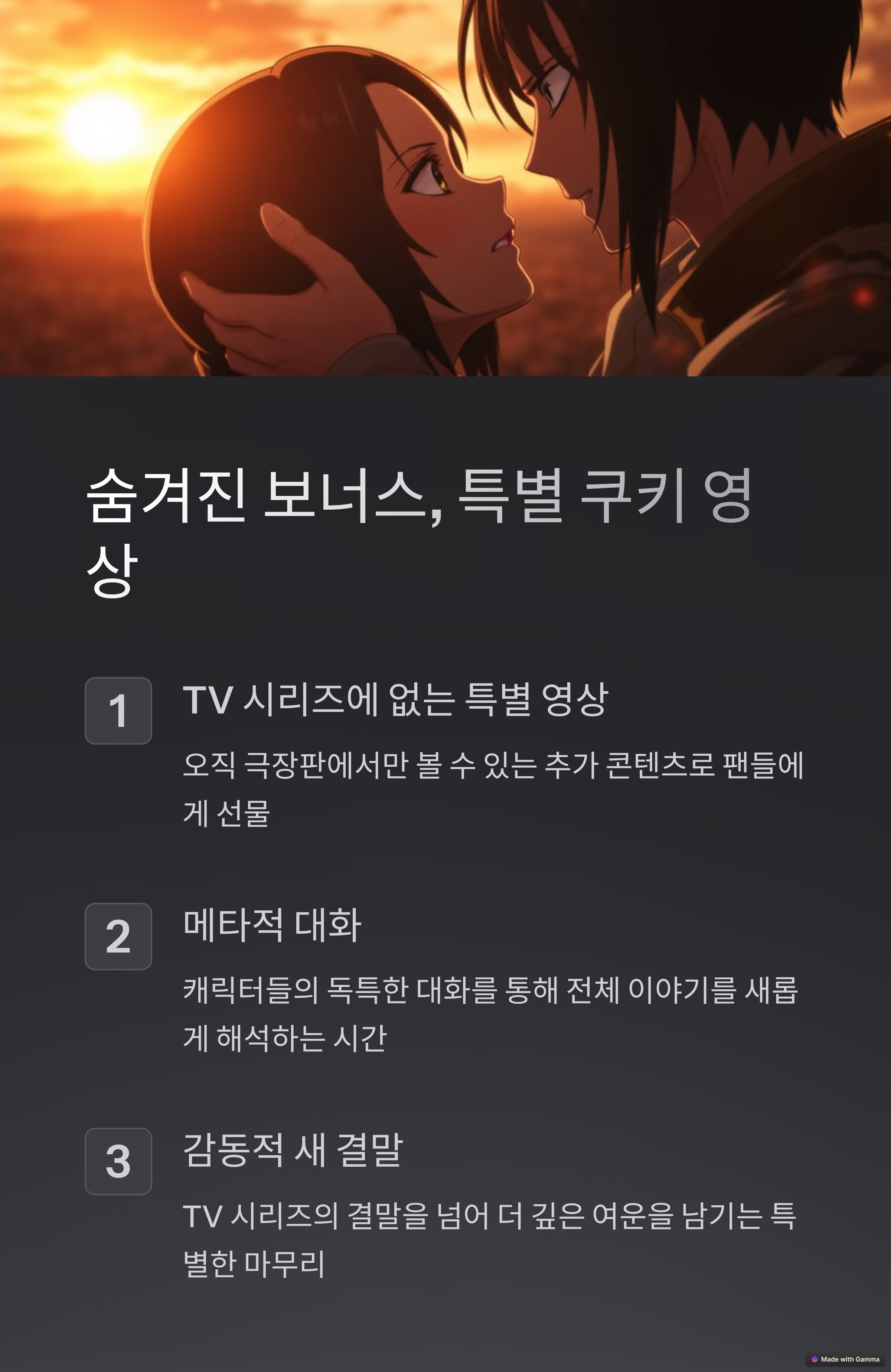 영화의 하이라이트 중 하나는 바로 쿠키 영상이었습니다. 단순한 후일담이 아니라 메타적인 대화가 포함된 장면이었으며, 팬들에게 깊은 여운을 남겼습니다. 이 장면에서는 주요 캐릭터들이 자신의 이야기를 돌아보며 새로운 시각에서 자신을 바라보는 순간이 담겨 있습니다. 이는 원작을 오랫동안 사랑해 온 팬들에게 특별한 의미를 주는 연출이었습니다.
