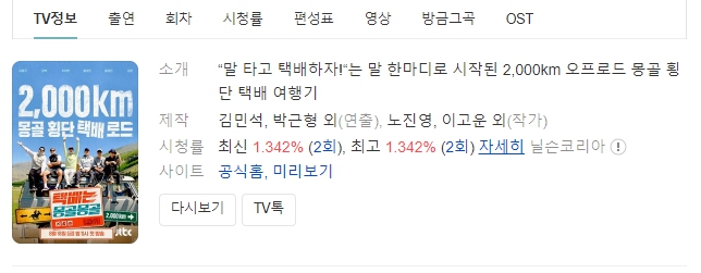 택배는 몽골몽골을 여행 예능은 1회때 1.2% 시작 출발했고~