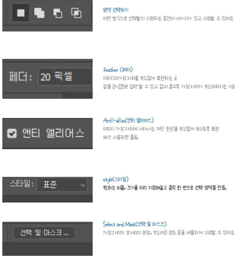위에 처럼 네 가지 방식으로 이미지에 원하는 영역에 선택을 하고 편집을