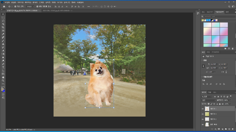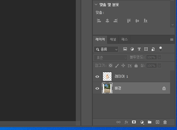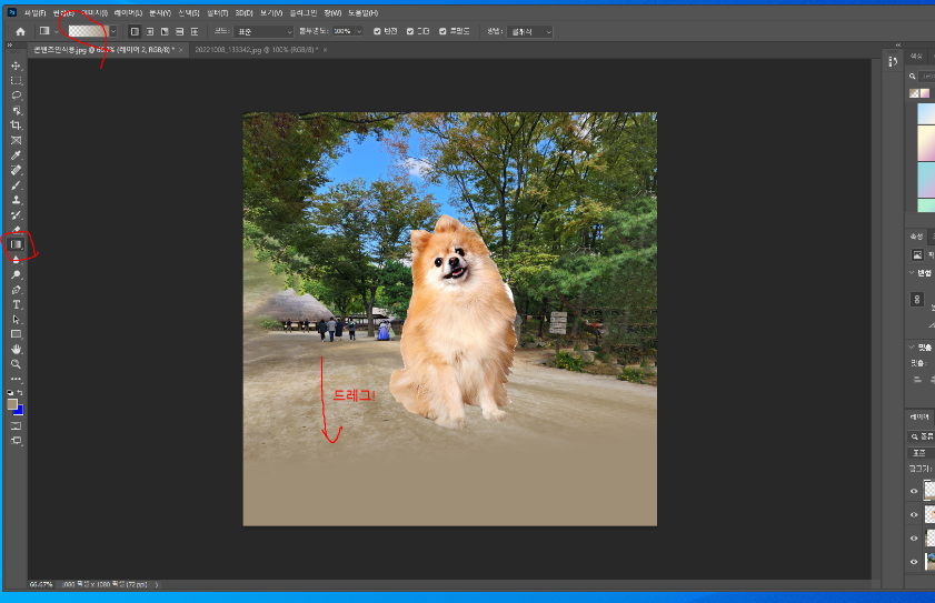 옆에 레이어 (Layers) 보면 배경사진과 강아지를 딴 레이어를 합칩니다.