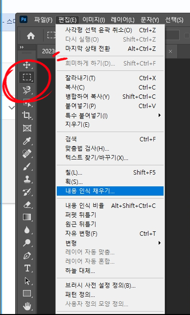 그리고 편집(Edit)-Content-Aware fill(콘텐츠 내용 인식 채우기 ) 누릅니다.
