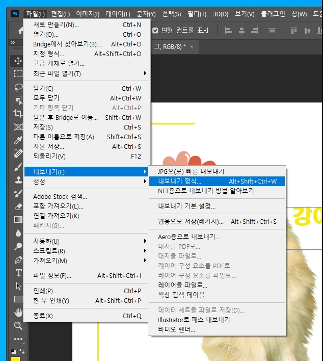 단축키 말고 메뉴바에서는 file에 들어가서 내보기 형식을 누릅니다