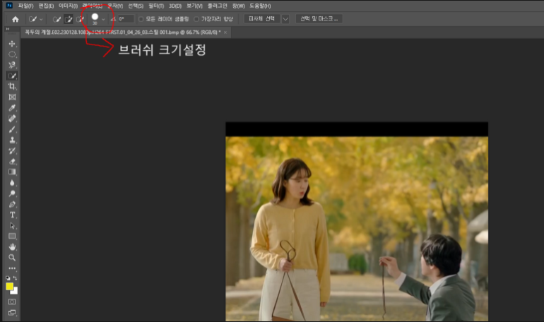 빠른 선택 도구 옵션바에는 브러시 모양의 클릭 버튼이 나오고 브러시의 크기를 설정해서 원하는 개체를 영역 선택 할 수 있습니다.