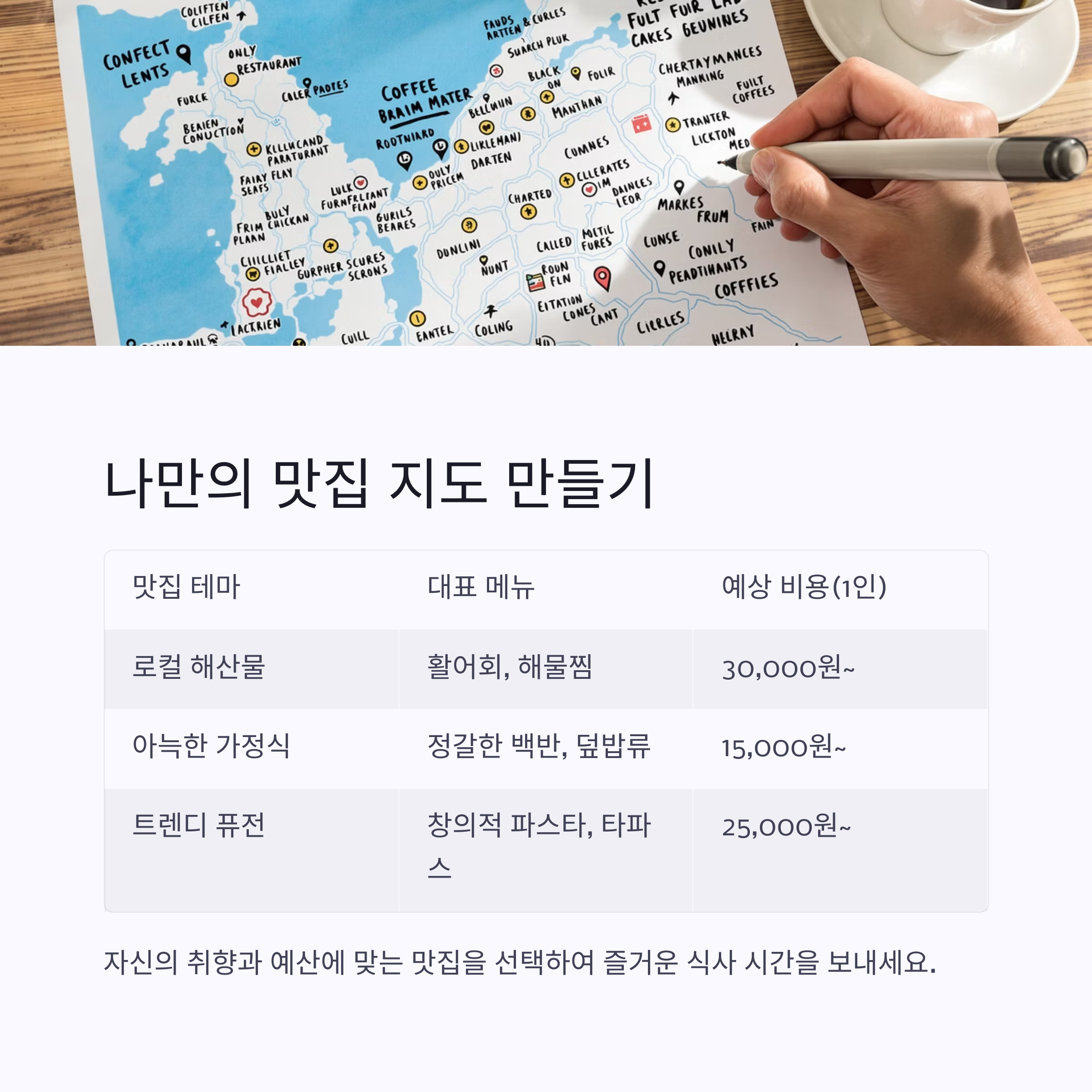 | 맛집 테마 | 대표 메뉴 예시 | 분위기 특징 | 예상 비용 (1인) |