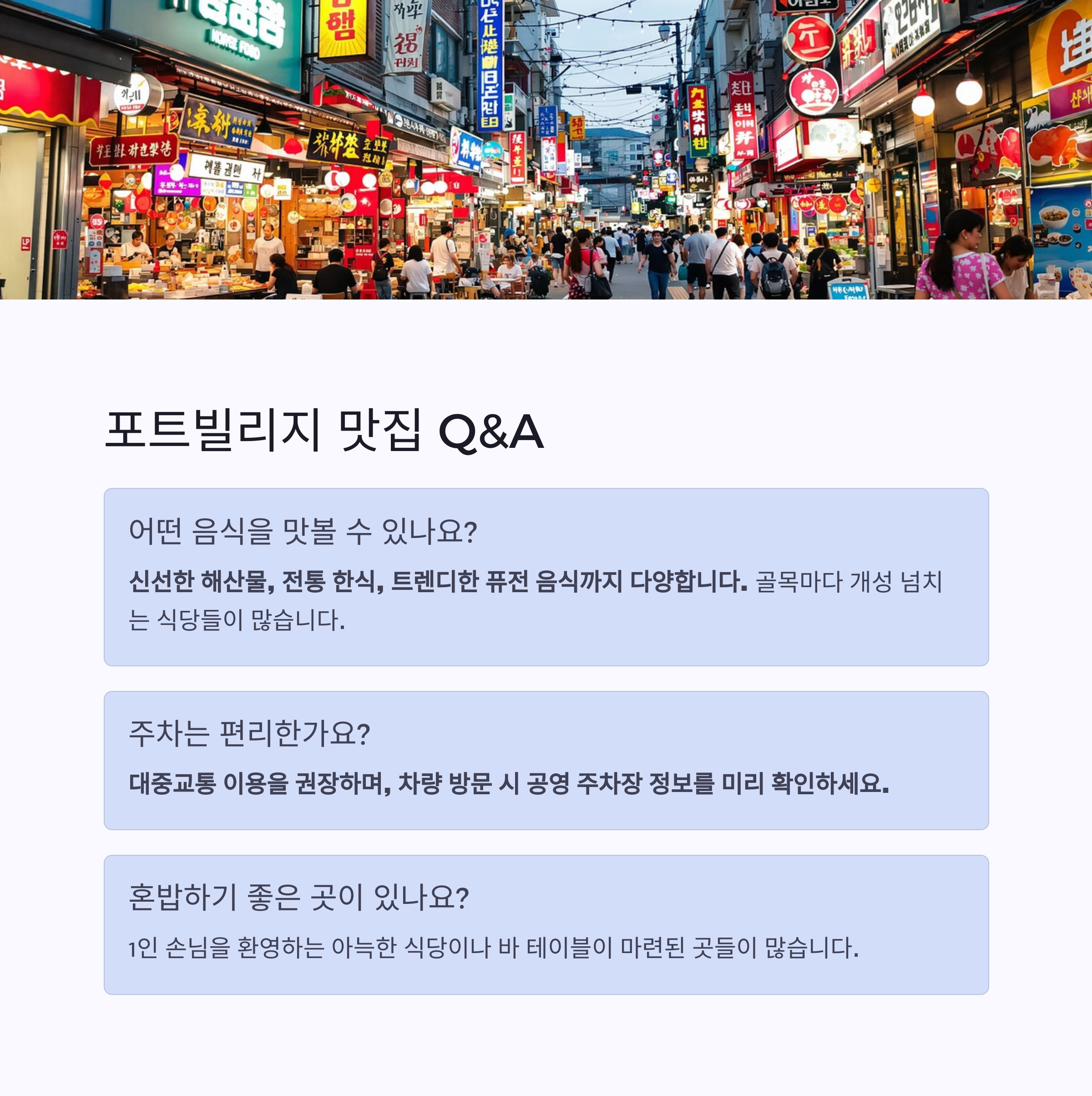 A: 포트빌리지는 항구 도시의 특성을 살린 신선한 해산물 요리부터 시작해서, 현지인들이 즐겨 찾는 전통 한식, 그리고 젊은 세대들의 입맛을 사로잡는 트렌디한 퓨전 음식까지 정말 다양합니다. 골목마다 개성 넘치는 식당들이 많으니 취향에 맞게 선택하는 재미가 있습니다.