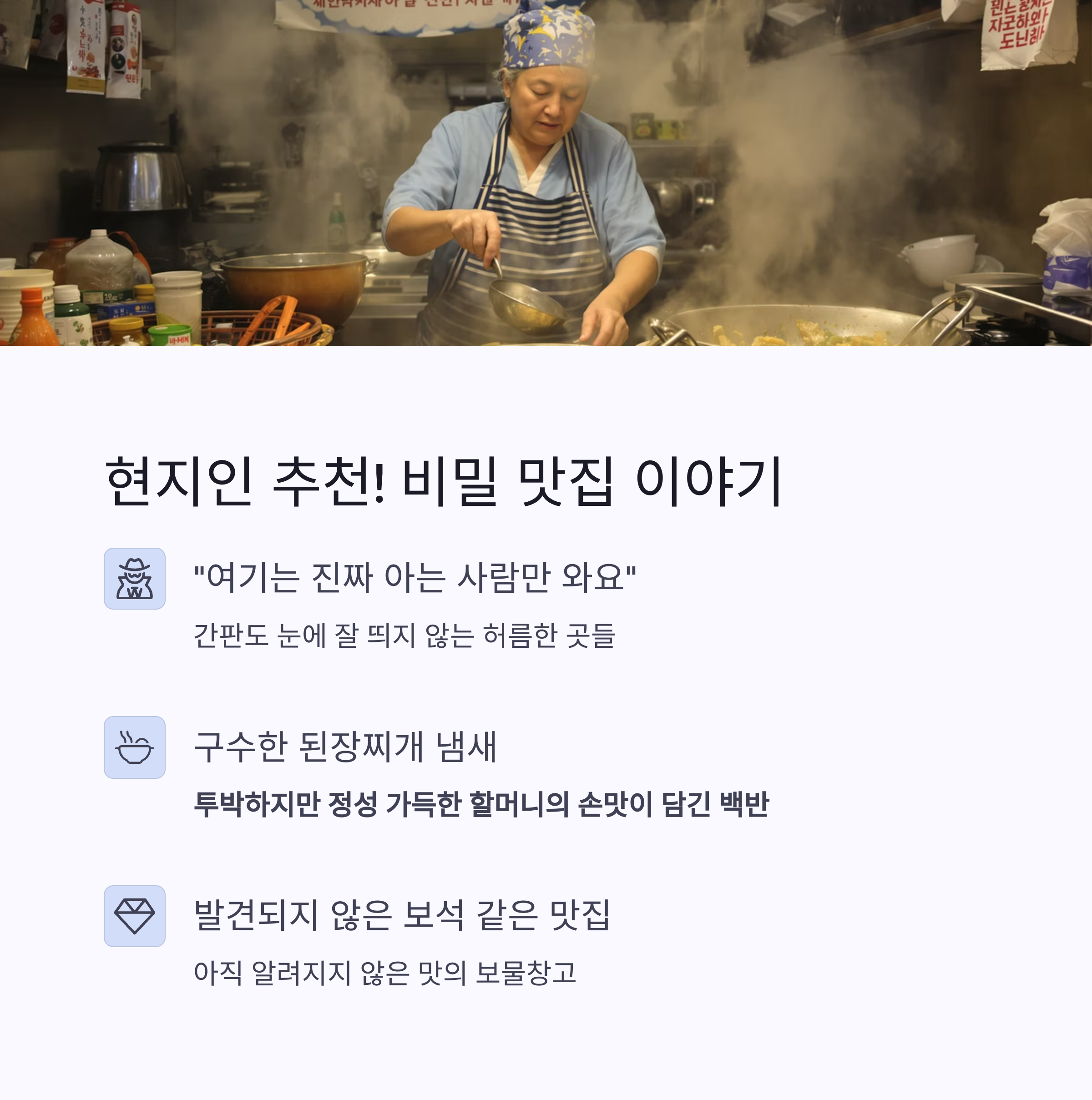 숨겨진 맛집을 발견하는 즐거움, 현지인과의 소통, 그리고 입안 가득 퍼지는 행복감은 여행을 더욱 특별하게 만듭니다.