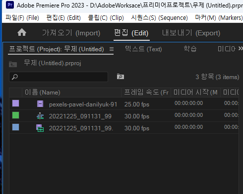 프로젝트 목록에 보면 동영상 파일은 한 개 더 임포트 하였다.