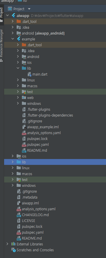 lib 폴더가 있는데 main.dart는 example폴더 아래 lib 폴더에 생성되고