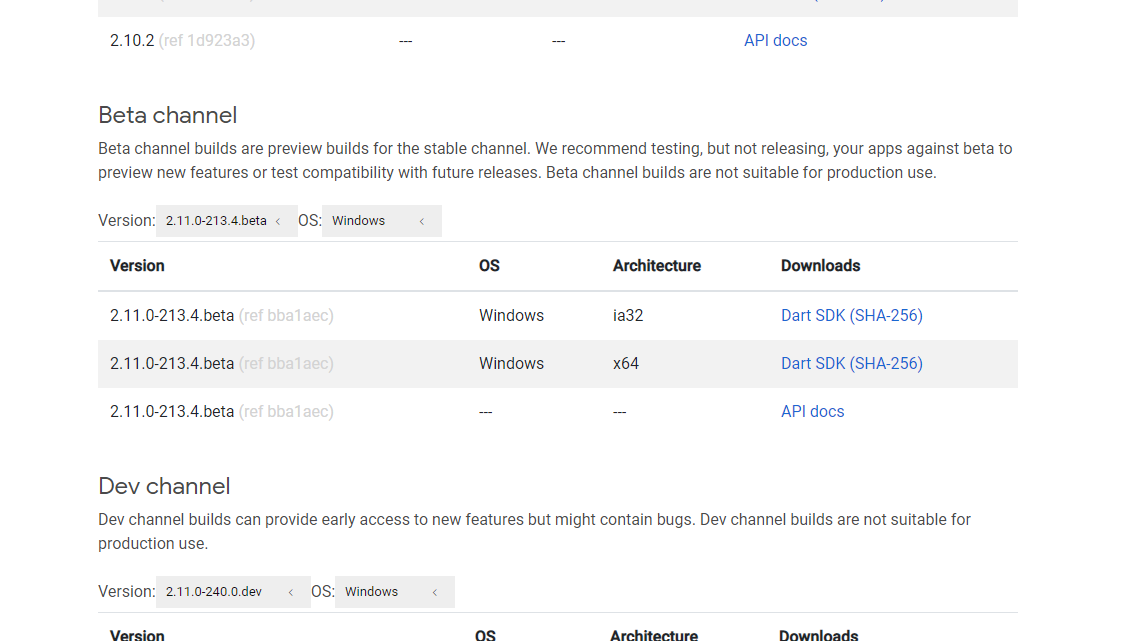Download specific stable and dev channel versions of the Dart SDK and the Dart API documentation.