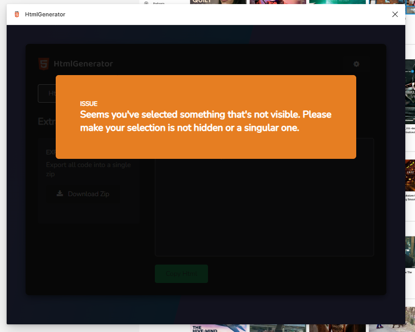 html로 만들 객체를 선택하지 않으면 이런 메시지가 나옵니다.