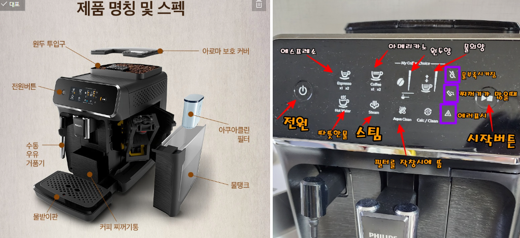 필립스 2200 가정용 전자동 커피 머신기 버튼 설명 정보