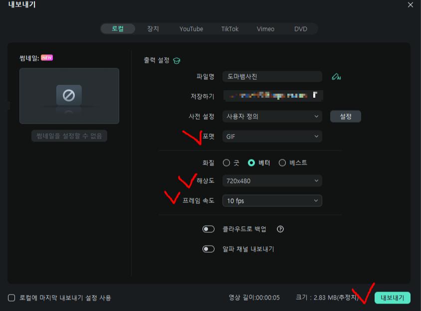 5. GIF 내보내기 설정 확인 및 저장
