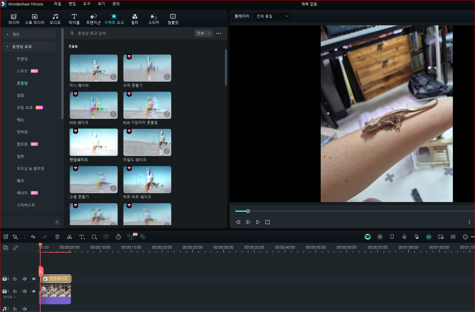 4. 이펙트 효과를 클릭!! 원하는 이펙트를 선택해서 타임라인에 끌어다가 놓습니다.
