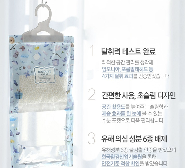여름철 습기와의 전쟁에서 승리할 수 있는 강력한 무기, 부케가르니 습기 제거제. 개별 포장된 디자인이 고급스러워 선물 받은 것 같은 느낌이 들며, 옷걸이 형태로 편리하게 사용할 수 있습니다. 염화 칼슘 성분이 강력한 제습 효과를 발휘하며, 언제 교체해야 할지 한눈에 알 수 있는 투명 비닐 덕분에 관리도 쉽습니다. 스탠드형 제품도 준비되어 있어 어디에나 쉽게 설치할 수 있습니다.
