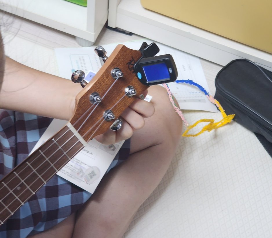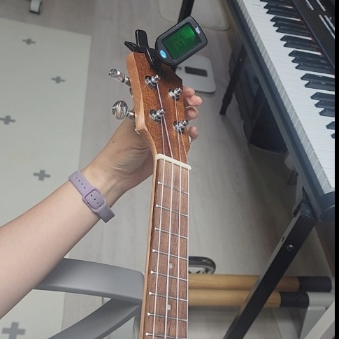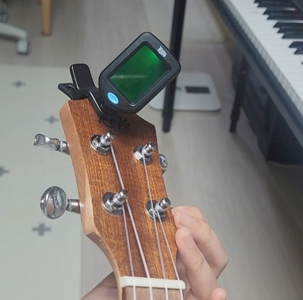 튜너를 우쿨렐레 헤드 끝쪽에 달고 천천히 튕기면서 조율기로 끈을 조절하면 음이 맞혀지는데요~